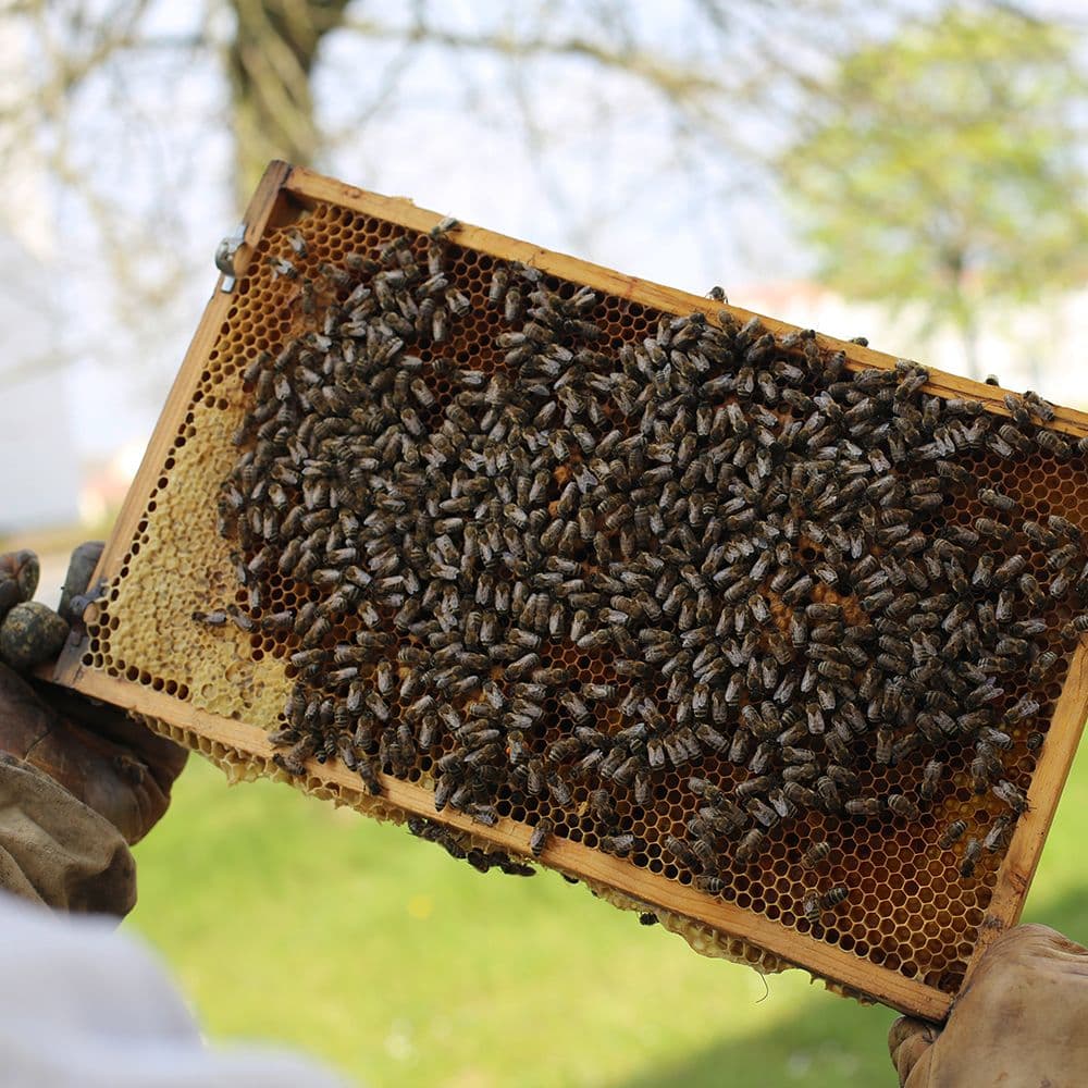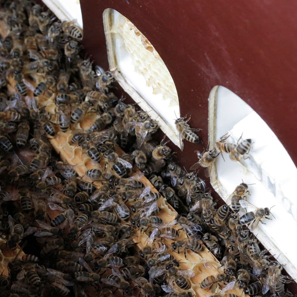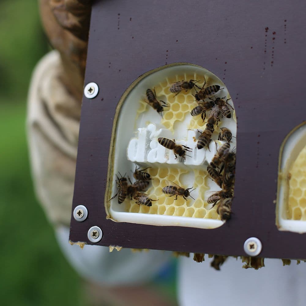 Maßgefertigte Boxen für die Gläser wurden in Bienenstöcken platziert. Jeder Stock produzierte seine eigenen organischen Etiketten.