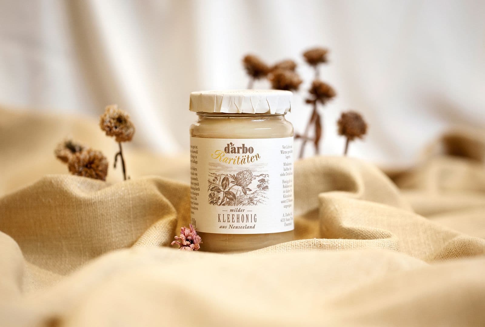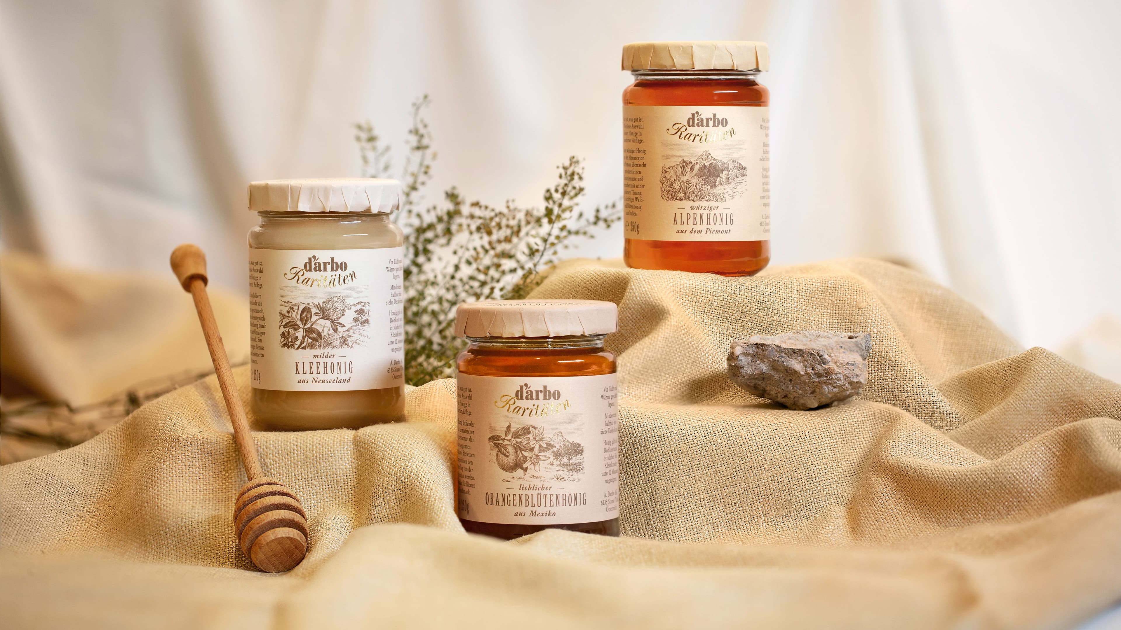 Unter der neuen Darbo-Produktkategorie „Raritäten“ wurden drei ganz besondere Honigsorten gelauncht. Der Look sollte sich in die bestehende Darbo-Range einordnen, und dennoch die Exklusivität einer limitierten Edition von Welt ausstrahlen.